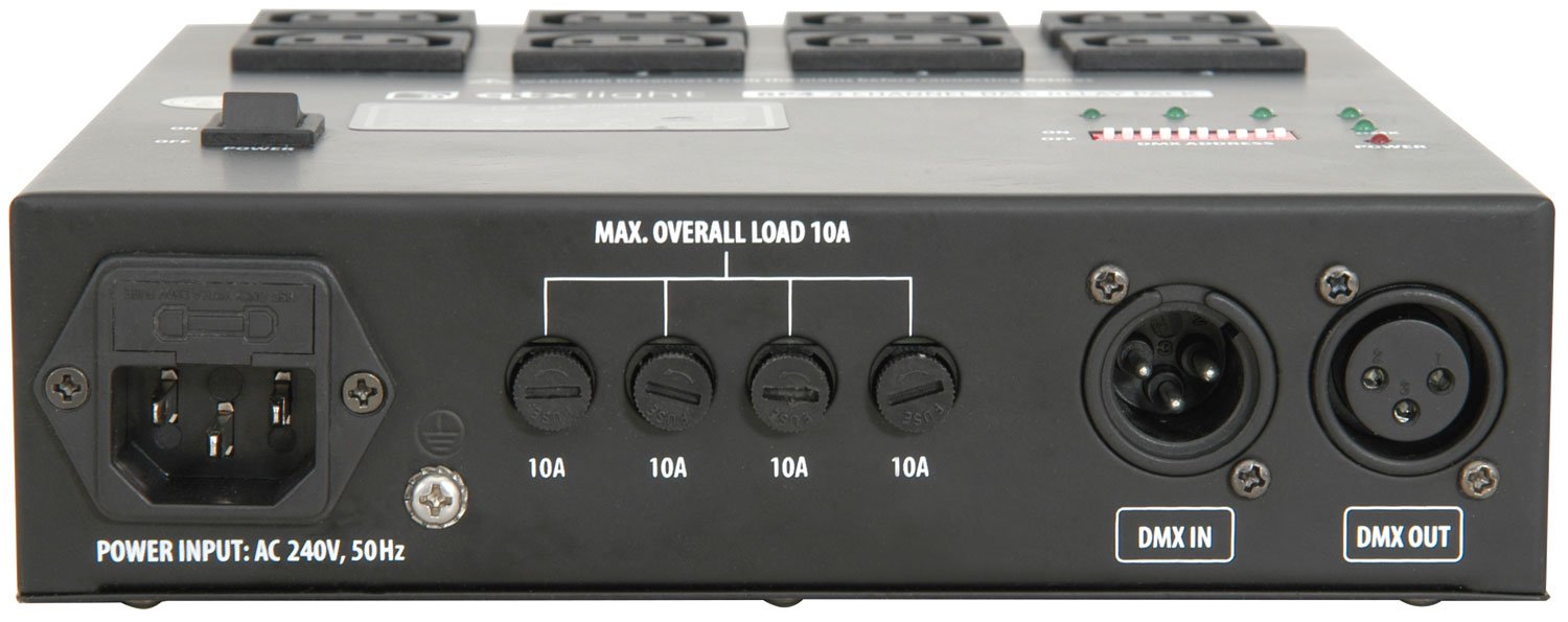 The RP4 4-channel DMX relay pack has 4 DMX channels each with 2 IEC power outputs per channel. It completely turns the power on and off saving energy and preserving the lifespan of your light effects. This is ideal for use with low-voltage LED light effects which, when used with dimmer packs, turn on and off randomly with the pulse voltage sent through the system.