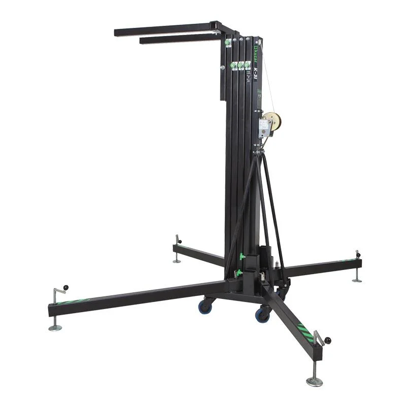 Designed for the professional user in the event and rental industry the lifters feature automatic locks for increased safety. Manufactured in Europe to both BGV C1 and CE (2006/42/CE) standards this multipurpose front load lifter is suitable for both truss and line array. The 5 aluminium sections are mounted on a robust steel base steadied by four steel outriggers each with a height adjustable foot. It includes the automatic ‘KAT’ triggers locking the sections as they rise and protecting the load in the unlikely event of cable breakage.