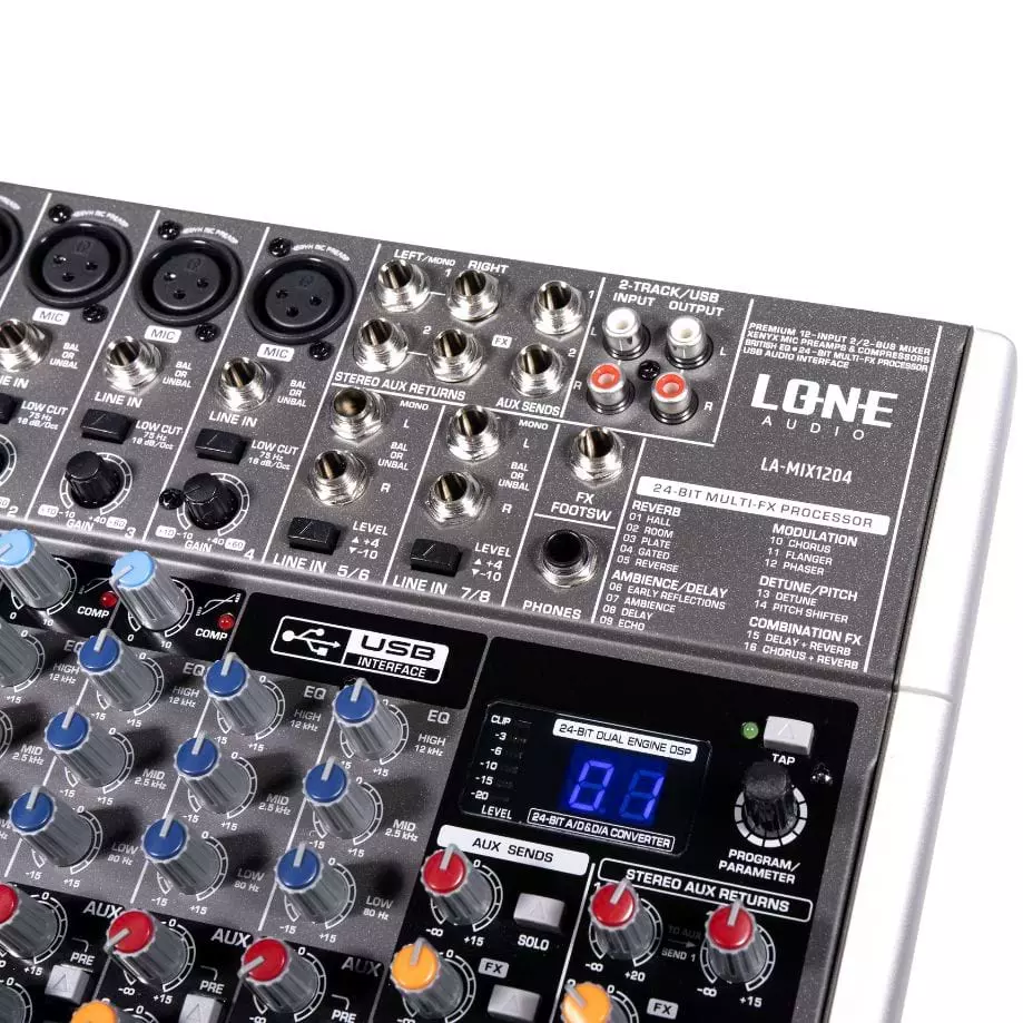 The Lone Audio LA-MIX1204 is a versatile 12-channel multimedia mixer designed to deliver professional-grade audio control in a compact, rack-mountable chassis. Ideal for live sound, recording studios, and podcasting, this mixer combines robust build quality with essential features. It operates on a standard 48V Phantom power supply and is equipped with four dedicated mic inputs featuring individual compressors and 75Hz low-cut filters. The integrated 24-bit effects processor provides 16 built-in presets to enhance your sound, while the built-in USB audio interface ensures seamless connectivity with your computer for recording or playback. With 3-band EQ, dual auxiliary outputs, and XLR main outputs, the LA-MIX1204 offers the flexibility and reliability needed for any multimedia application.